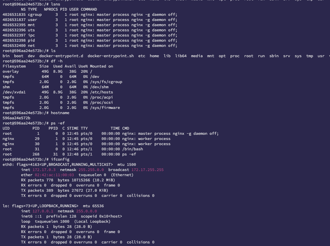 컨테이너에서 lsns명령어를 쳐보면 다음과 같은 컨테이너 격리기술이 있는것을 확인할 수 있다.