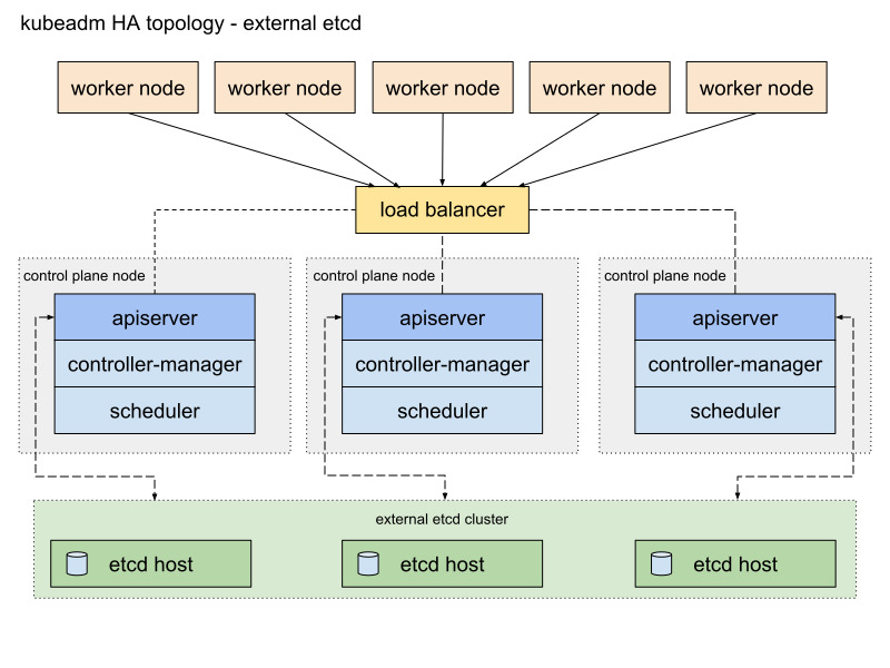 kube-apiserver는 로드 밸런서를 통해 워커 노드에 노출되며, 이 로드 밸런서는 요청을 여러 제어 평면 노드로 분산시켜 고가용성을 유지한다. 한마디로 컨트롤플레인을 여러개 두어 각각의 apiserver와 etcd를 두면서 고가용성을 유지하는 것이다.