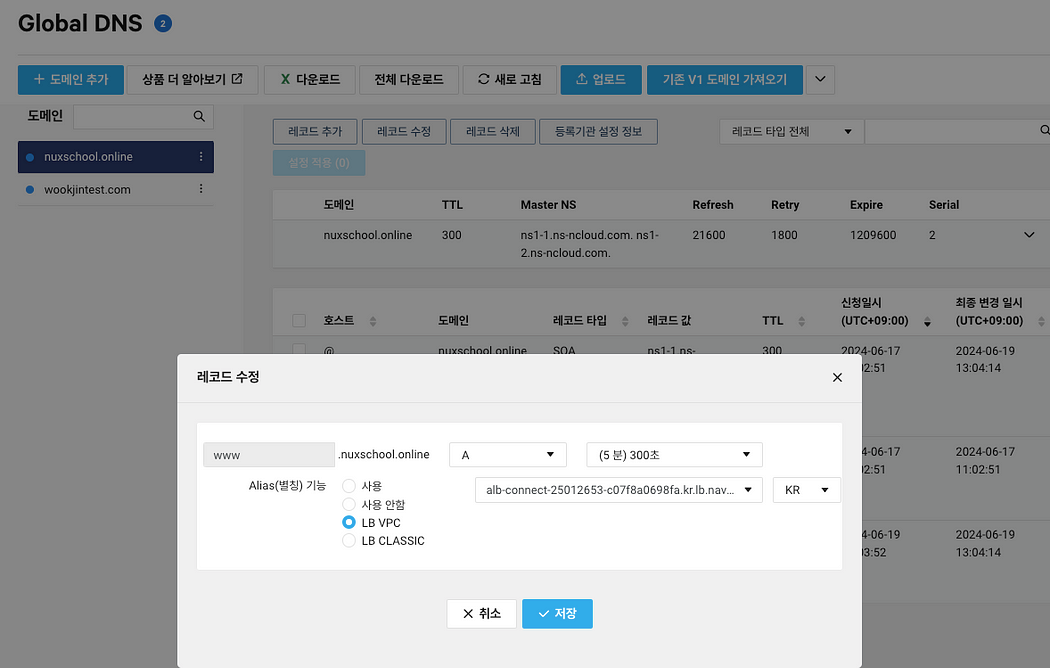 - ALB주소를 A레코드로 Global DNS 도메인 매핑