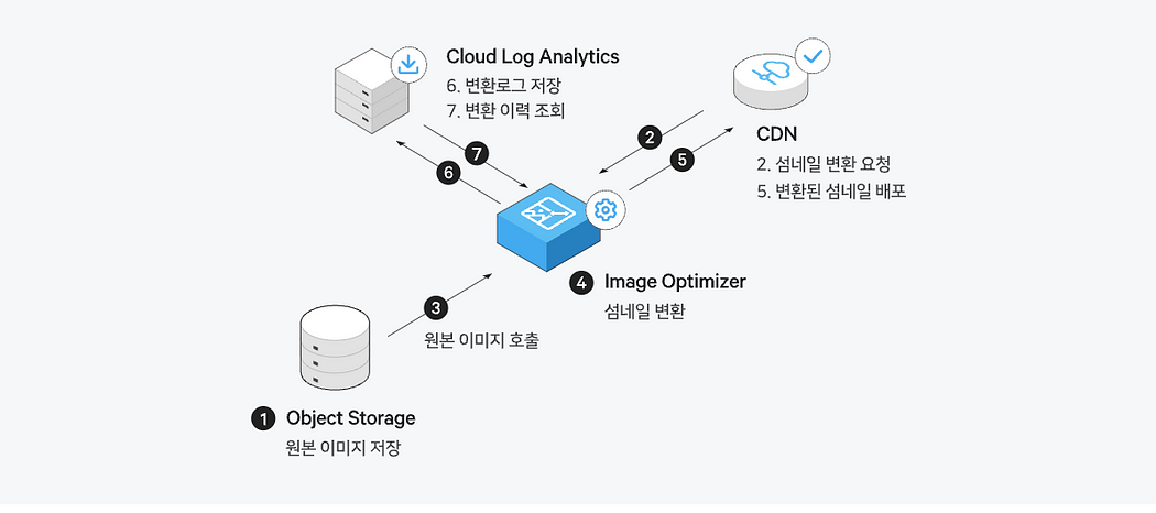 Image Optimizer는 Object Storage, CDN, Cloud Log Analytics와 연동해서 사용할 수 있다. 아래는 Image Optimizer의 아키텍처 구성이다.