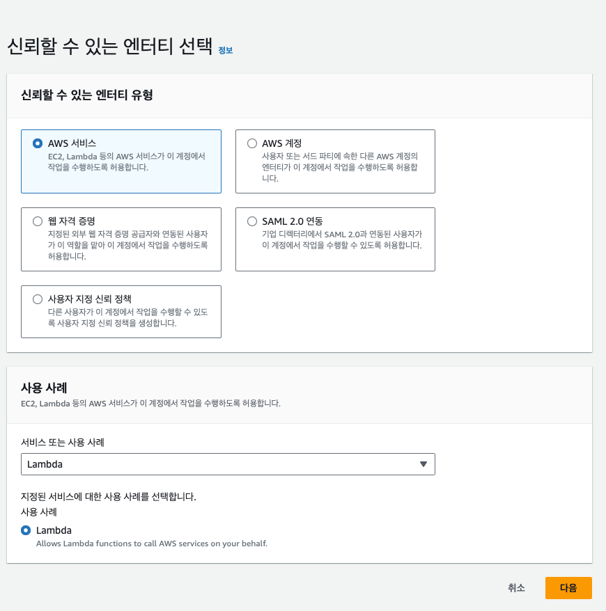 두 번째로 필요한 역할은 AWS Lambda 함수용 IAM 역할이다. 이 역할은 Lambda가 MediaConvert 작업을 시작하고, S3 버킷에 접근할 수 있도록 구성해야 한다. 다음과 같이 먼저 Lambda 역할 부터 생성해준다.