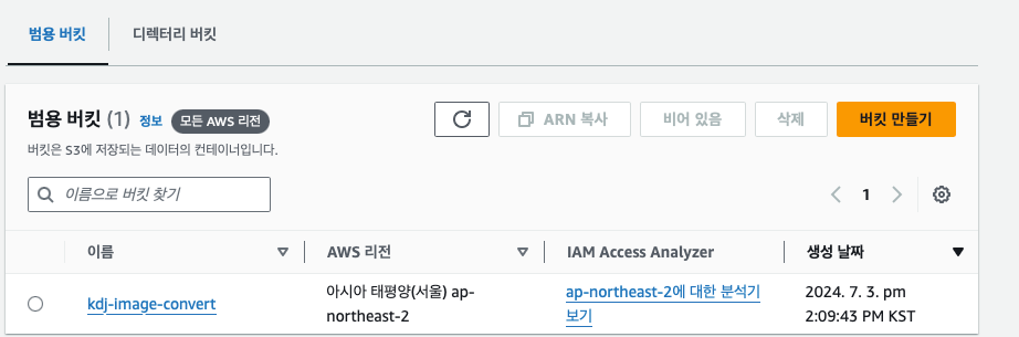 실제 운영 환경에서는 S3 버킷을 두 개로 분리하여, 하나는 Input 용, 다른 하나는 Output 용으로 사용하는 것이 일반적이다. 이렇게 분리하면 Lambda 함수가 같은 버킷을 반복해서 트리거하는 재귀 호출 문제를 방지할 수 있어, 불필요한 리소스 사용과 비용 증가를 줄일 수 있다. 하지만 이번 실습에서는 간단한 테스트 목적이므로, 단일 S3 버킷 내에 디렉터리 구조로 Input과 Output 경로를 구분하여 사용하도록 하겠다. 따라서 하나의 범용 버킷만 생성하고, 내부 경로만 나누어 구성한다.
