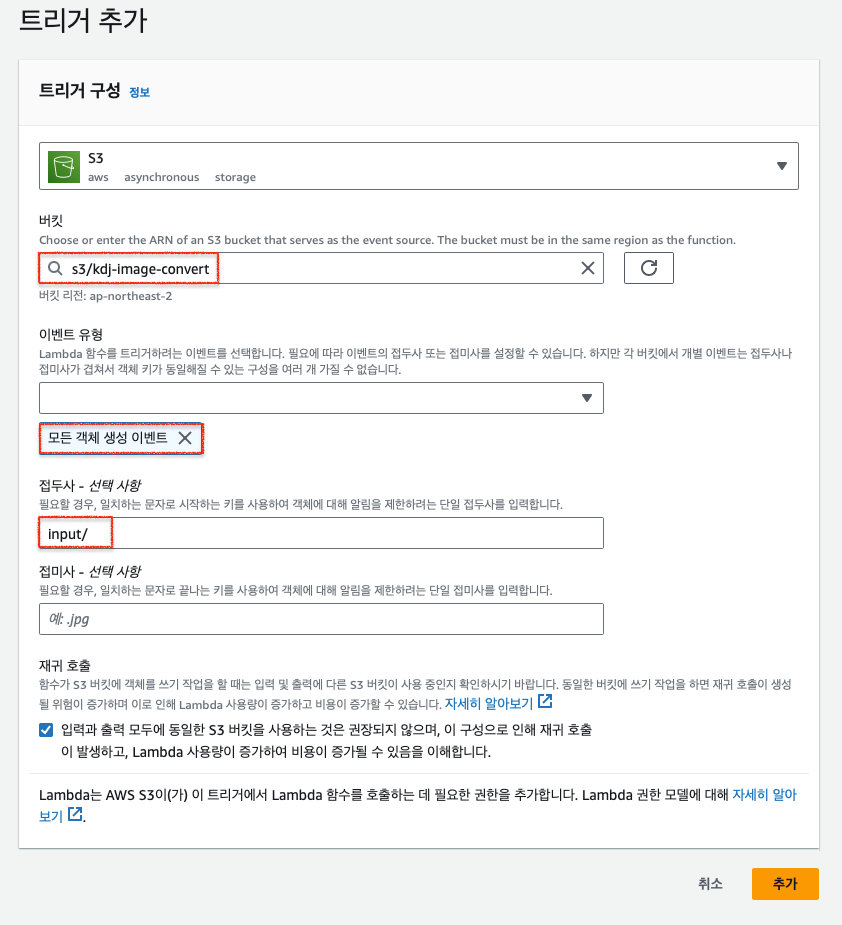 이벤트 유형에는 모든객체 생성 이벤트를 선택해주고 접두사 옵션을 통해 input/경로를 사용할 수 있도록 설정해준다.