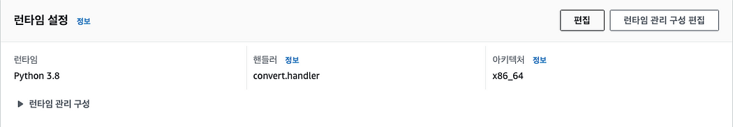 또한 Lambda 함수의 런타임 핸들러 설정을 변경해주어야 한다. AWS Lambda의 핸들러 규칙은 [파일명].[메서드명] 형식을 따르며, 이 규칙에 따라 Lambda가 이벤트 발생 시 어떤 코드를 실행할지를 결정한다. 이번 실습에서는 업로드한 파일 중 convert.py가 Lambda의 동작을 담당한다. 이 파일 안에 정의된 handler 메서드를 호출하도록 설정해야 한다. 따라서 Lambda 콘솔의 핸들러 입력란에는 convert.handler로 지정한다.