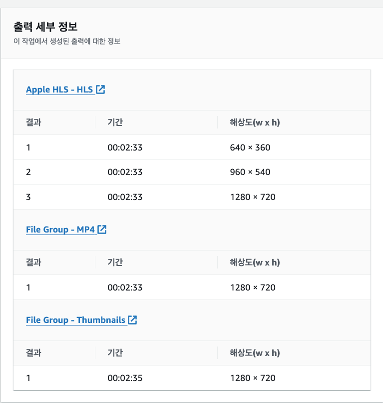 현재 사용 중인 job.json 파일에는 총 세 개의 출력 그룹(Output Group)이 설정되어 있다. 첫 번째는 HLS 출력 그룹으로, 비디오를 360p, 540p, 720p의 세 가지 해상도로 트랜스코딩하여 HLS 스트리밍에 적합한 형태로 출력되도록 구성되어 있다. 두 번째는 MP4 출력 그룹으로, 720p 해상도의 단일 MP4 파일을 생성하며 다운로드 및 저장용으로 활용된다. 마지막은 Thumbnail 출력 그룹으로, 입력된 비디오에서 5초마다 한 프레임씩 이미지를 캡처하여 썸네일로 출력한다.