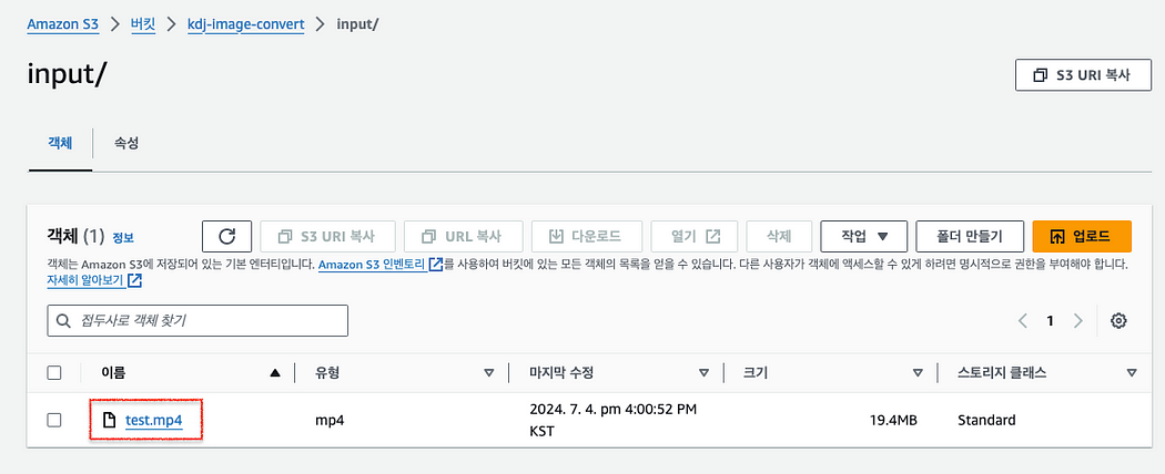 다음과 같이 S3 input경로에 test.mp4 파일 하나를 업로드 해주었다.