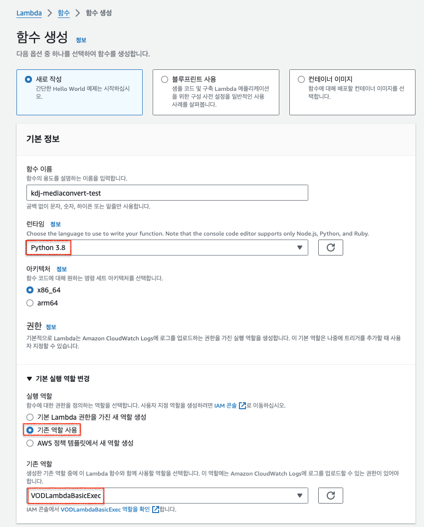 다음 Lambda함수를 작성해준다. 런타임은 python 3.8 역할은 기존에 만들어두었던 VODLambdaBasicExec 역할을 선택해준다.