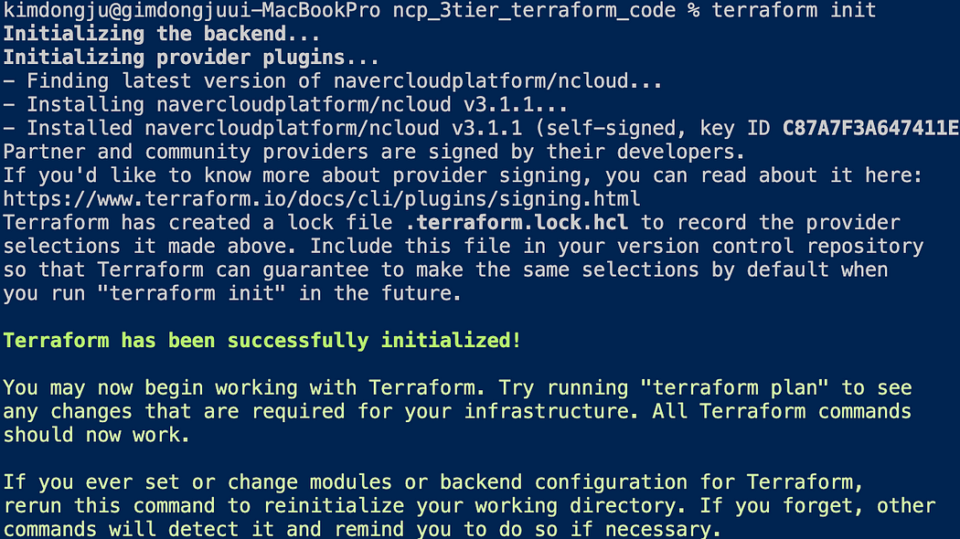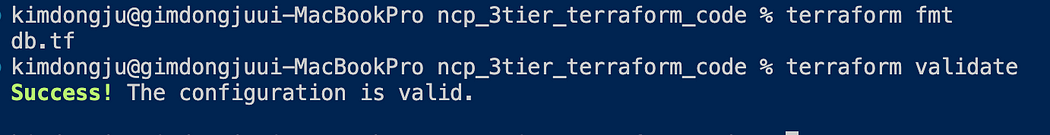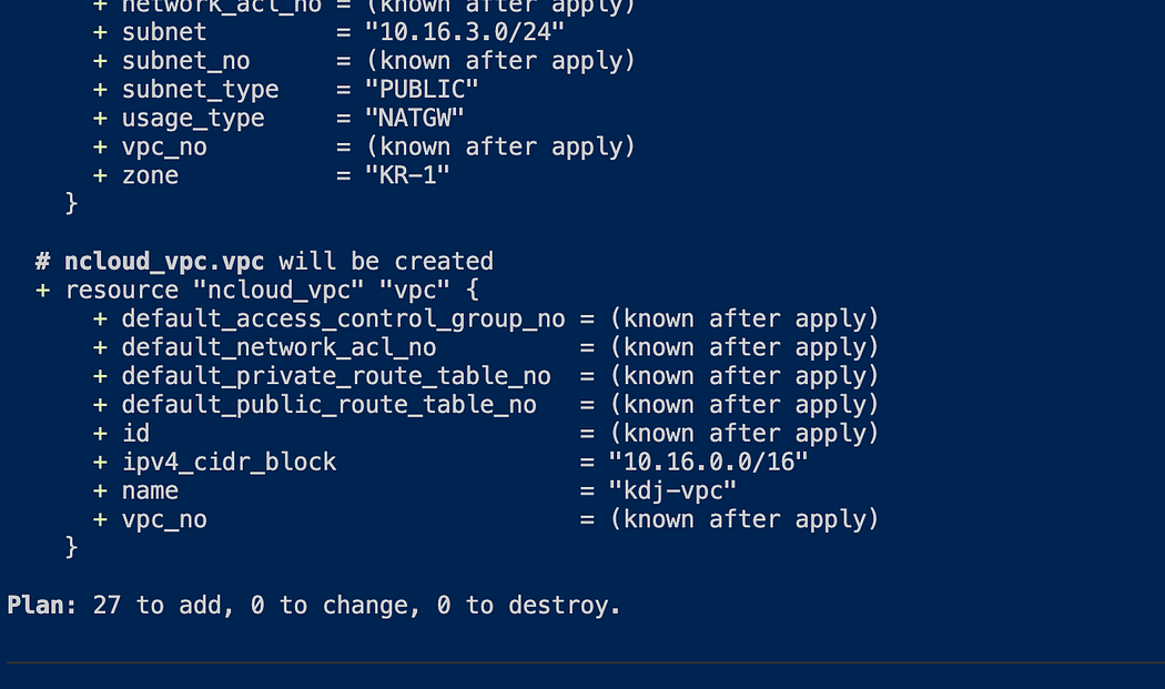 이후 terraform init(초기 설정) -> terraform fmt(코드 정리)-> terraform validate(코드 검사) -> tarraform plan(변경 계획 보기) -> tarraform apply(변경 적용)를 통해 작성한 tf 파일로 ncp인프라 소스를 생성할 수 있다.