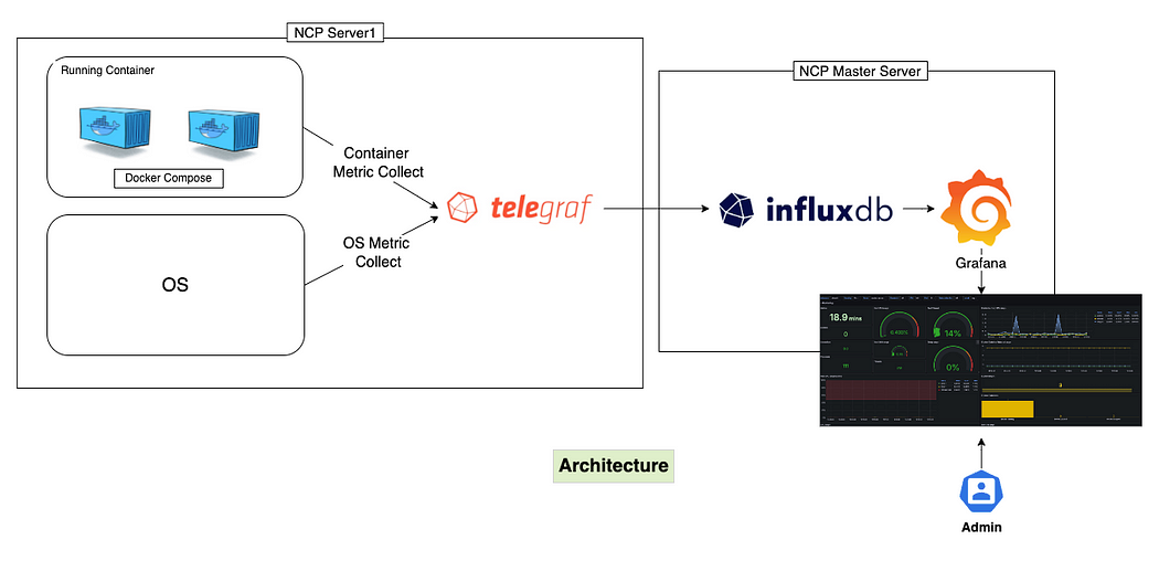 Telegraf는 Target Server에서 시스템 메트릭을 수집하고, 이를 InfluxDB에 저장한다. Master Server에 구축된 InfluxDB는 수집된 데이터를 저장하는 역할을 하며, Grafana는 InfluxDB와 연결되어 해당 데이터를 시각화하는 대시보드를 제공한다.