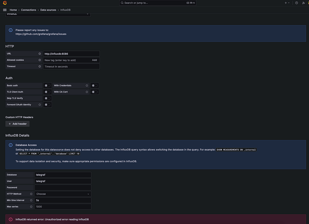 데이터 소스를 확인한 결과, InfluxDB에 대한 인증 오류가 발생하였다. 이를 해결하기 위해, InfluxDB에서 수동으로 토큰을 발급받아 문제를 해결해주었다.