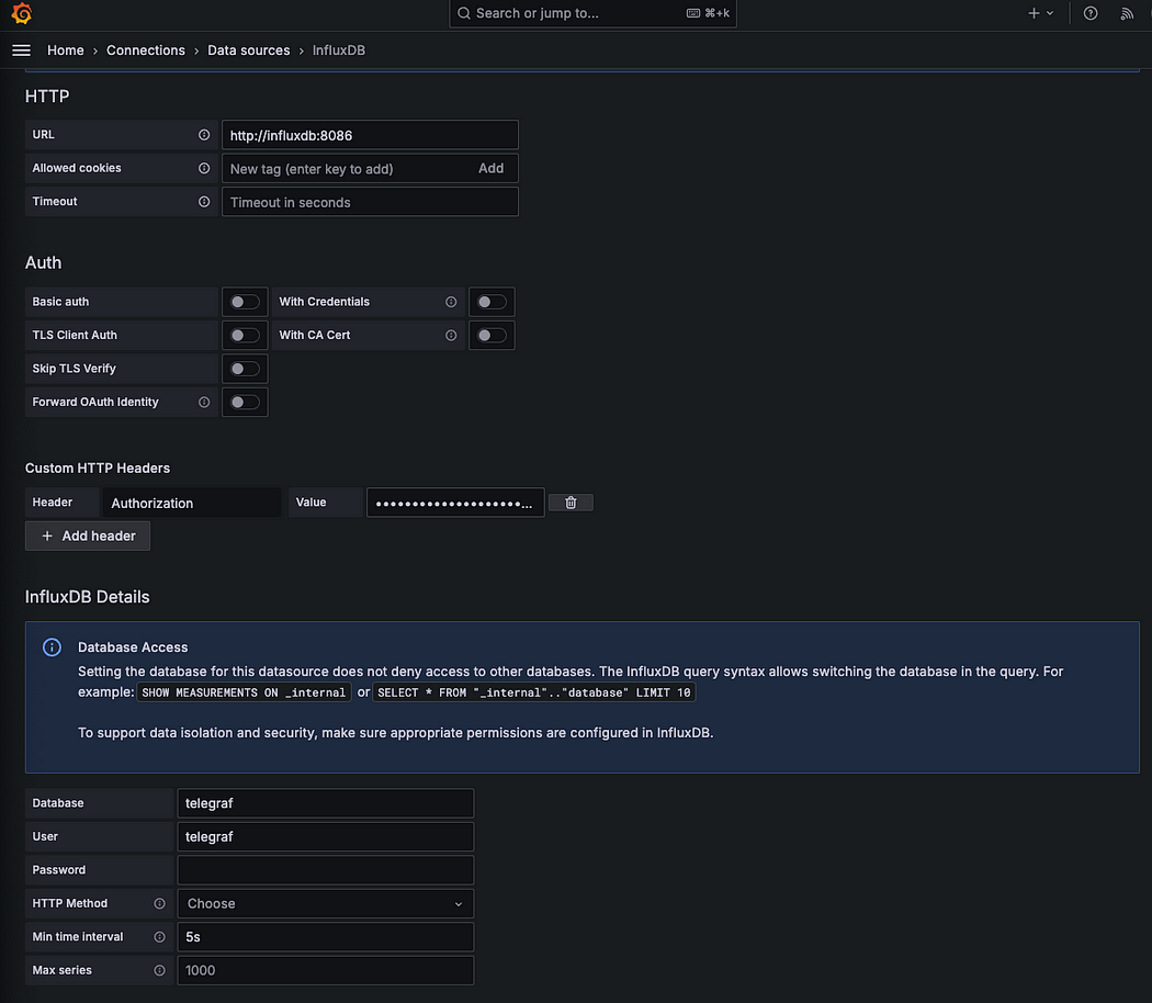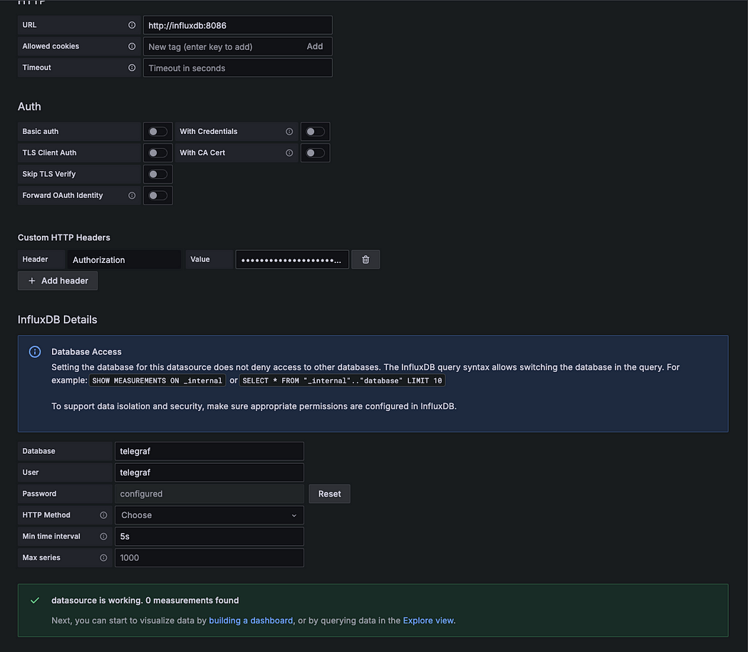 다만, 토큰 기반 인증은 InfluxDB 구축 이후에만 발급되기 때문에,데이터 소스 설정은 수동으로 진행해야 한다. 이 파일은 추후 테스트를 하기 위해 작성하였다.