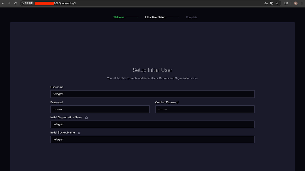 http://$master-server-ip:8086 주소를 통해 InfluxDB 대시보드에 접속한다. 이후 name, bucket, organization은 telegraf.conf 파일에 설정해둔 값을 기준으로 입력해준다.