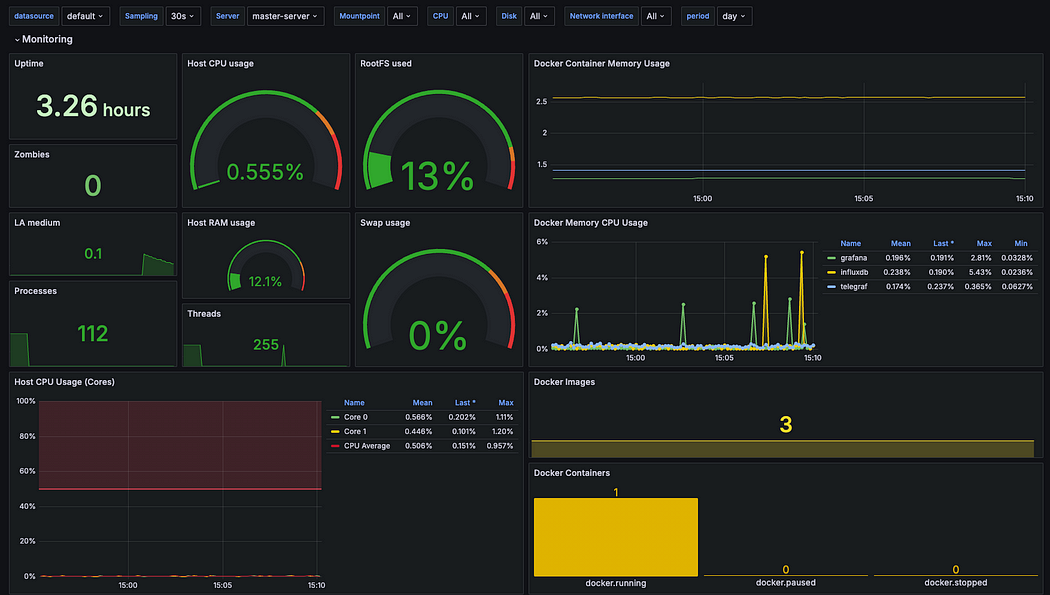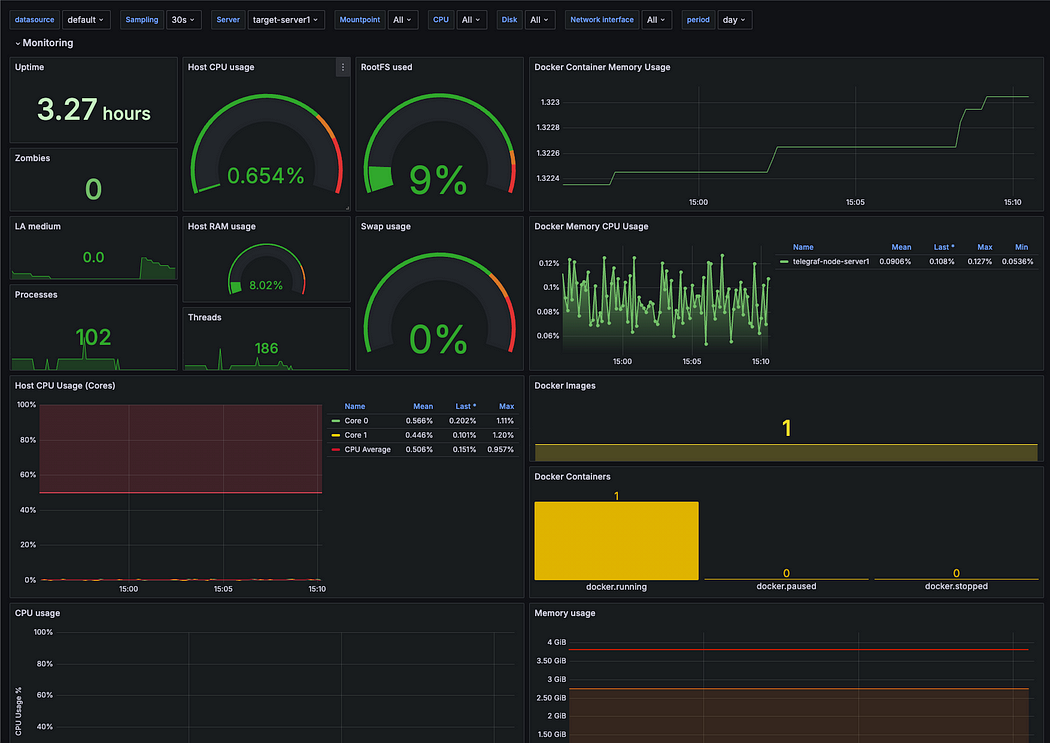 대시보드를 확인하면, Telegraf를 통해 수집된 OS 메트릭과 Docker 메트릭이 InfluxDB에 저장되고, 이 데이터가 Grafana 대시보드에 시각화된 것을 볼 수 있습니다.