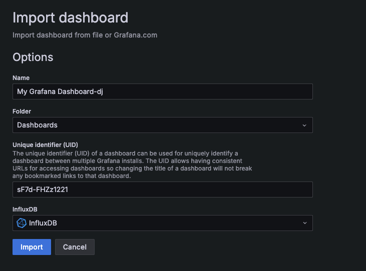 커스터마이징한 대시보드 JSON 파일을 업로드한 뒤, Name만 설정해주면 된다. 이렇게 Import를 완료하면, 다음과 같이 Grafana에서 대시보드가 정상적으로 구축된 모습을 확인할 수 있다.