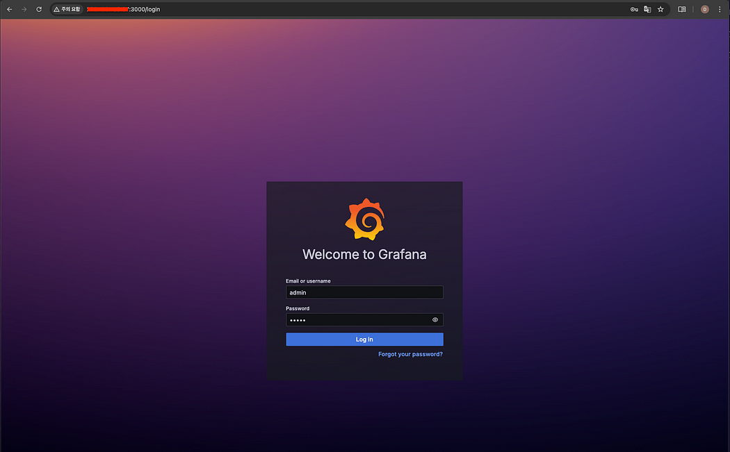 Grafana, InfluxDB, Telegraf 컨테이너가 정상적으로 실행되었다. 다음 단계로, 웹 브라우저에서 http://$master-server-ip:3000 URL을 통해 Grafana 대시보드에 접속해 보겠다.