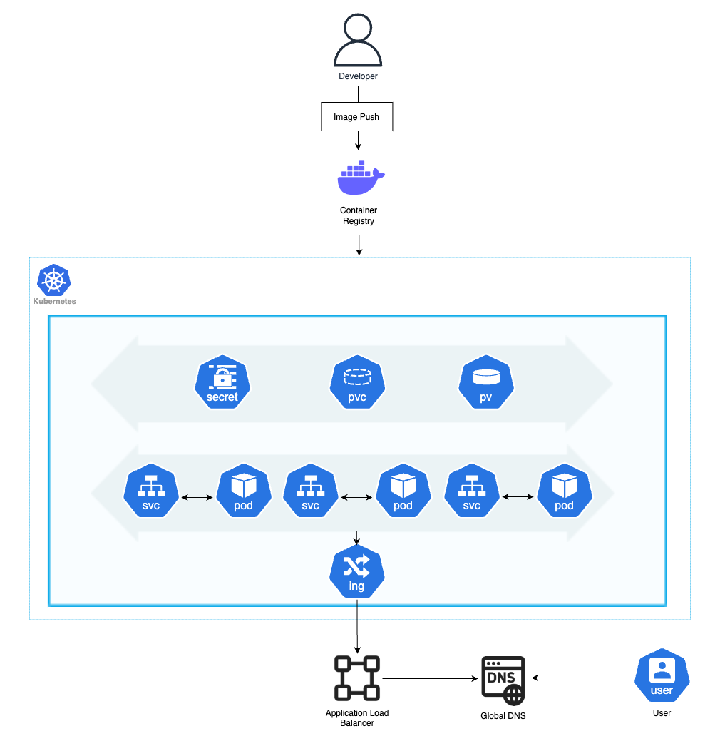 또한, PVC를 이용한 볼륨 관리, Secret을 통한 민감 정보 처리, DNS 설정을 통한 도메인 연결까지 진행하여, SSL 인증서를 제외한 모든 주요 구성 요소를 테스트해보는 것을 목표이다. Node는 하나만 띄워 테스트를 진행하였다.