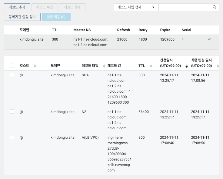 ingress alb kimdongju.site ing-mern-merningress-27dd8-100409304-3669ec287cc4.kr.lb.naverncp.com 80 17m