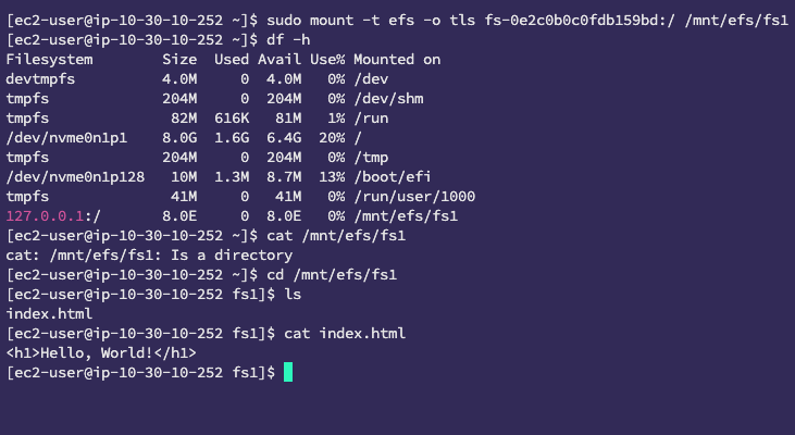 [ec2-user@ip-10-30-14-99 ~]$ echo '<h1>Hello, World!</h1>' | sudo tee /mnt/efs/fs1/index.html