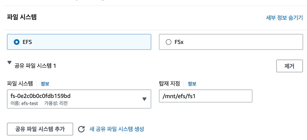 파일 시스템을 추가하여 기존에 생성해 둔 EFS를 연결한 후, 생성하면 된다. EFS 전용 보안 그룹은 이미 따로 설정했으므로 체크를 해제해주면 된다.