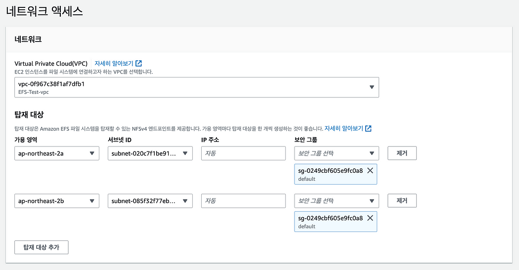 기존에 설정해 둔 EFS 보안 그룹을 선택하면 된다.