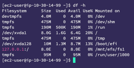 서버에 접속하여 df -h 명령어를 실행한 결과, 정상적으로 EFS가 마운트된 것을 확인할 수 있다. 다음으로, EFS가 다른 서버와 데이터를 공유할 수 있는지 테스트 과정을 진행해 보겠다.