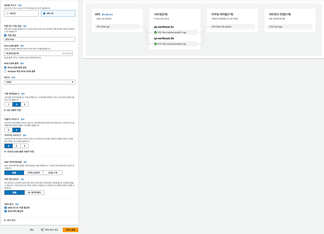 VPC 내 가용 영역 별 Subnet을 설정하고 서버를 생성한 후, EFS 테스트를 진행할 예정이다. 이 과정에서 반드시 VPC의 DNS 확인 기능을 활성화해야 한다.