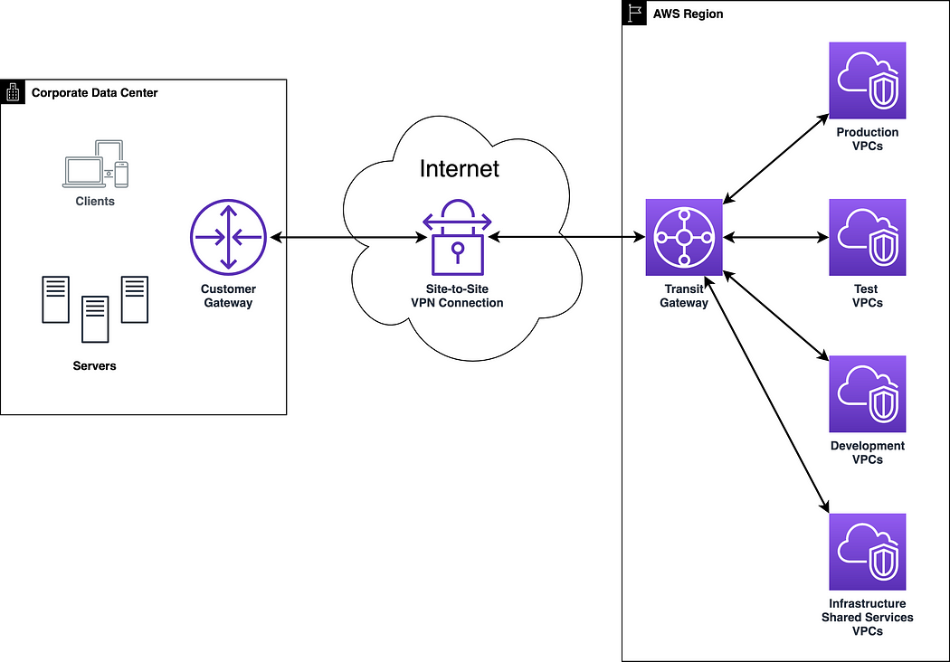 - 온프레미스 네트워크를 Transit Gateway에 연결(Site-to-Site VPN 사용).