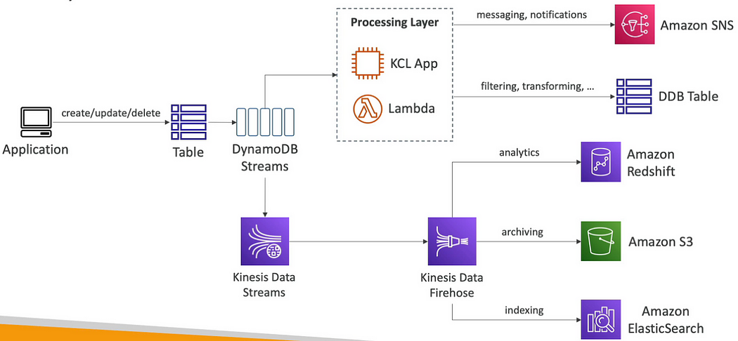 - AWS Lambda 또는 Kinesis Client Library (KCL) 기반 애플리케이션이 DynamoDB Streams를 구독하여 실시간으로 변경 사항을 처리한다.