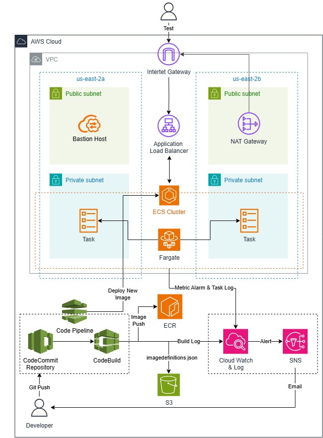 본 프로젝트는 AWS CodeCommit, CodeBuild, CodePipeline을 연동하여 CI/CD 파이프라인을 구축하고, ECS Fargate 기반의 Task를 통해 웹 서비스를 배포하도록 구성하였다. 인프라는 Terraform으로 선언형 코드화하여 ECS 서비스, 배포 파이프라인, 로깅 및 모니터링 설정까지 자동화하였다.