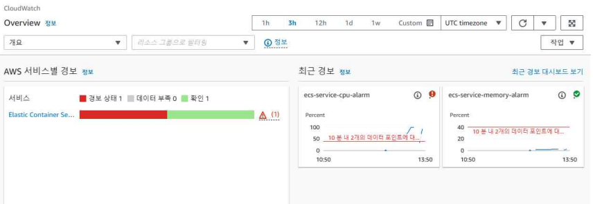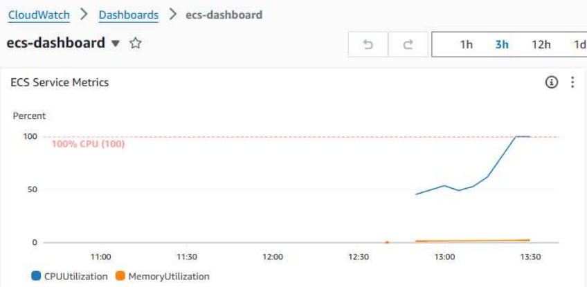 이미지가 ECS에 배포된 후, CloudWatch Dashboard를 통해 CPU 사용률을 모니터링한 결과, 설정한 기준치를 초과한 것을 확인할 수 있었다.