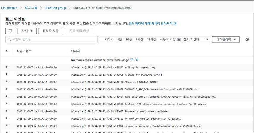해당 로그그룹은 CodeBuild에서 빌드 작업 중 발생한 로그 이벤트를 CloudWatch Logs로 수집한 것이다.