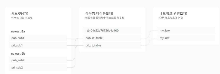 서로 다른 가용 영역에 퍼블릭 서브넷 2개와 프라이빗 서브넷 2개를 생성하고, 서브넷별로 라우팅을 분리한 구조이다. 퍼블릭 서브넷은 인터넷 게이트웨이(IGW)를 통해 외부 통신이 가능하며, 프라이빗 서브넷은 NAT 게이트웨이를 통해 제한된 외부 접근만 허용하도록 구성하였다. 프라이빗 서브넷에는 ECS가 배포된다.