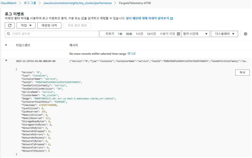 해당 로그는 ECS Cluster에 설정된 Container Insights를 통해 수집된 Log Event를 보여준다.