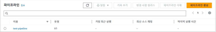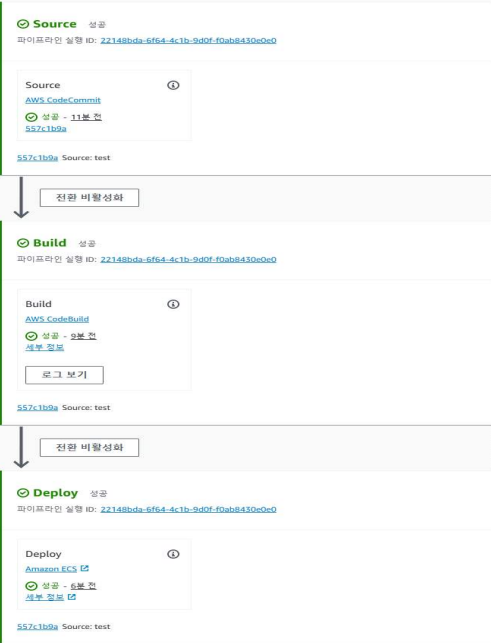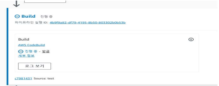 → AWS의 Git 저장소 역할로, 변경 사항이 발생하면 파이프라인이 자동으로 트리거된다. - CodePipeline이 실행되며 CI/CD 파이프라인이 시작된다.