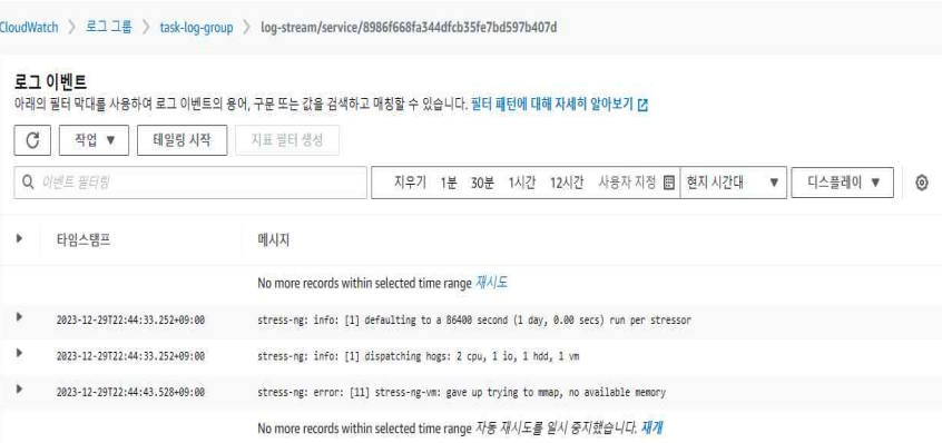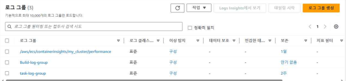 해당 로그는 ECS Task의 LogConfiguration 설정을 통해 수집된 로그를 확인할 수 있는 CloudWatch 로그 그룹이다.