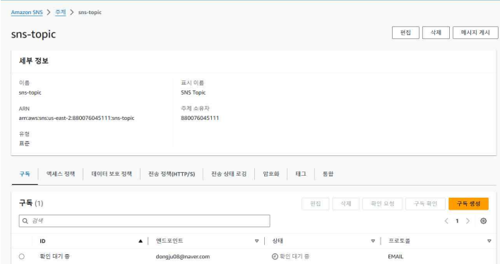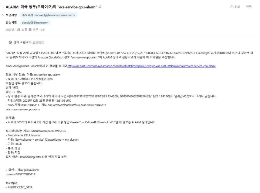CPU 부하가 발생하자, 설정해둔 CloudWatch Metric Alarm이 트리거되어 SNS 토픽을 통해 이메일로 경보 알림이 전송되었다.