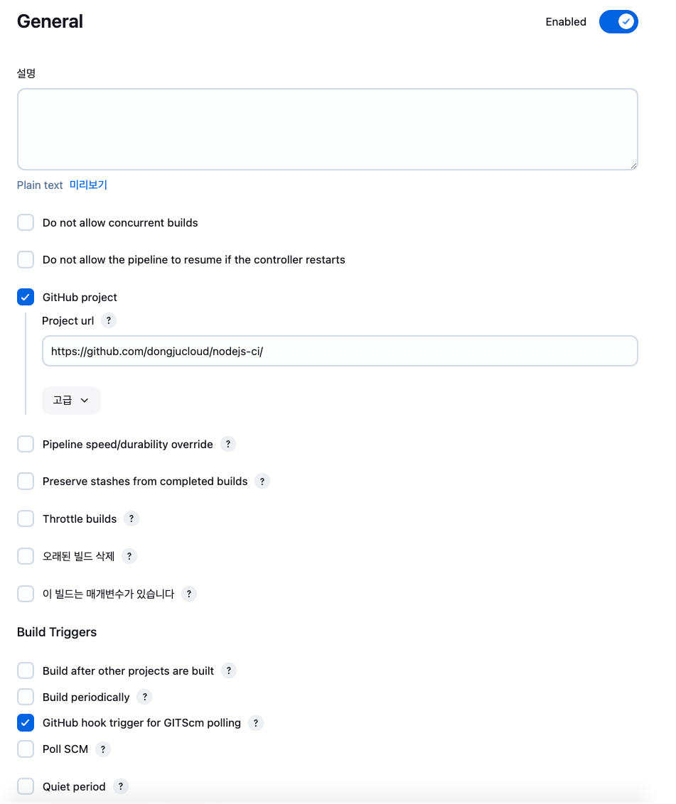 다음은 New item에서 pipeline을 통해 프로젝트를 생성해준다. 자신의 소스코드를 올릴 github url를 입력해주고 Build Triggers로 "Github hook trigger for GITScm polling" 를 선택해준다. 다음으로 파이프라인 관련 설정을 해주면 된다.