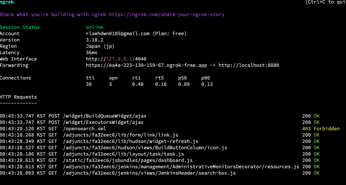 그리고 현재 컨테이너의 jenkins가 8080포트로 띄워져 있기 떄문에 ngrok http 8080 명령어를 사용해준다.